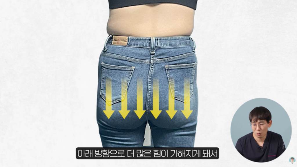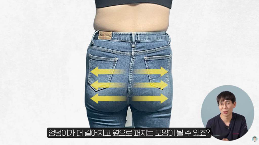 - 지방의 무게를 견디지 못한 처짐: 엉덩이 아래쪽에 지방이 많이 모이면 그 무게로 인해 아래 방향으로 힘이 가해지며 엉덩이가 길어집니다.
